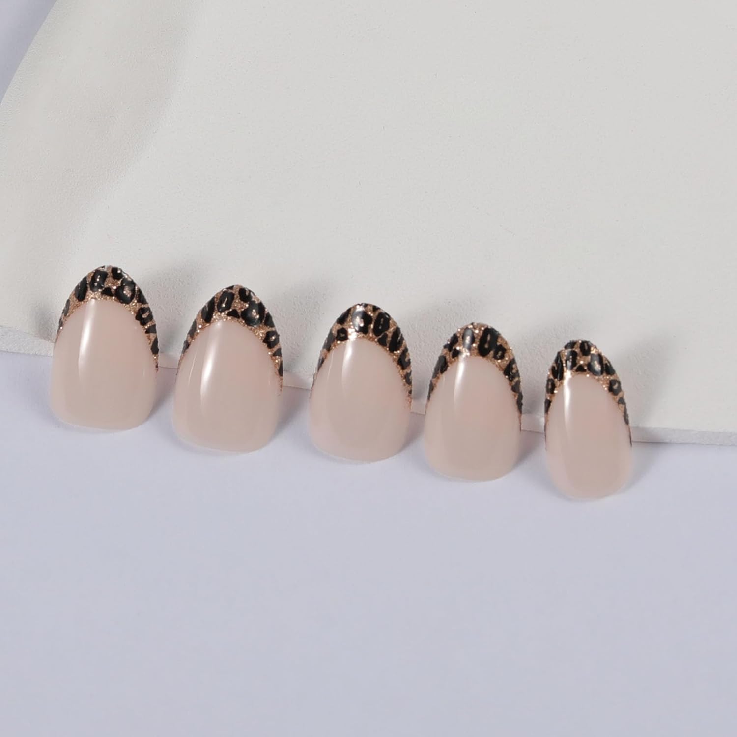 Nude Leopard French Tip Press On Nails Almond, Glossy Soft Gel Fake Nails with Nail Glue, 12 Sizes – 24PCS Thick Natural Reusable Glue On Nails for Women