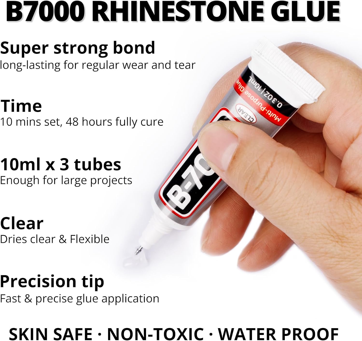 - B7000 Clear Glue for Gemstones -- B7000 glue has strong adhesion and dries clear, waterproof when dried, non-toxic and harmless to the skin. The glue has a precision needle for easy application, they can be applied precisely