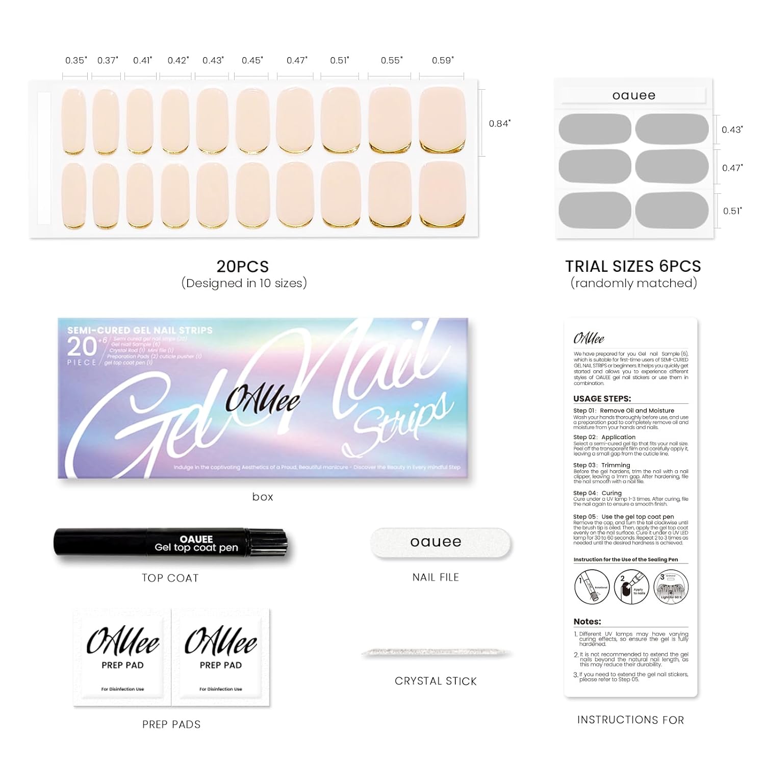 - Product Upgrade: OAUEE has developed an upgrade plan to make the edges of the gel nail stickers more snug, allowing even beginners to better use our gel nail stickers. To achieve a salon-level manicure effect, we have added tempered gel topcoat, enabling professional manicure enthusiasts to better customize their nail shapes