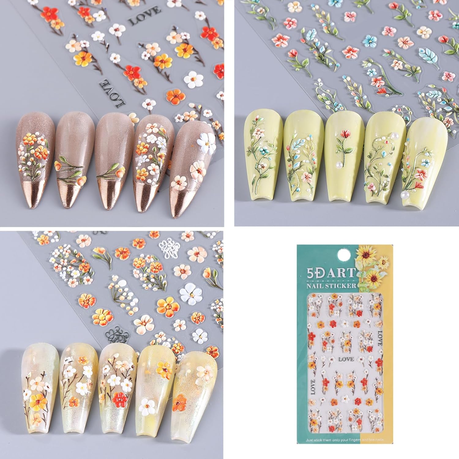 5D Embossed Nail Stickers 3Pcs Summer Colorful Flowers Leaves Nail Stickers for Nail Art Spring Floral Leaf Plant Self-Adhesive Sliders Nails Decals for Women and Girls Manicure Decoration Supplies