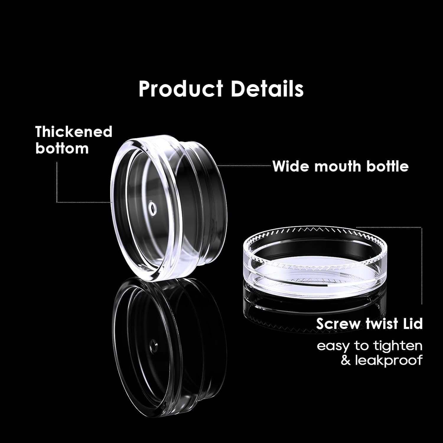 - ★【LEAK PROOF AND AIRTIGHT】: Each tiny cosmetic sample jar comes with a screw-on lid . For storing creams, lip balms and other ointments, just tighten the lid normally and there is no need to worry about leakage at all. For storing oily liquid cosmetics of a lower consistency, you will need to tighten the lids a little harder to avoid leaks in the travel cosmetic containers in your package if the lids come loose due to a weak closure.