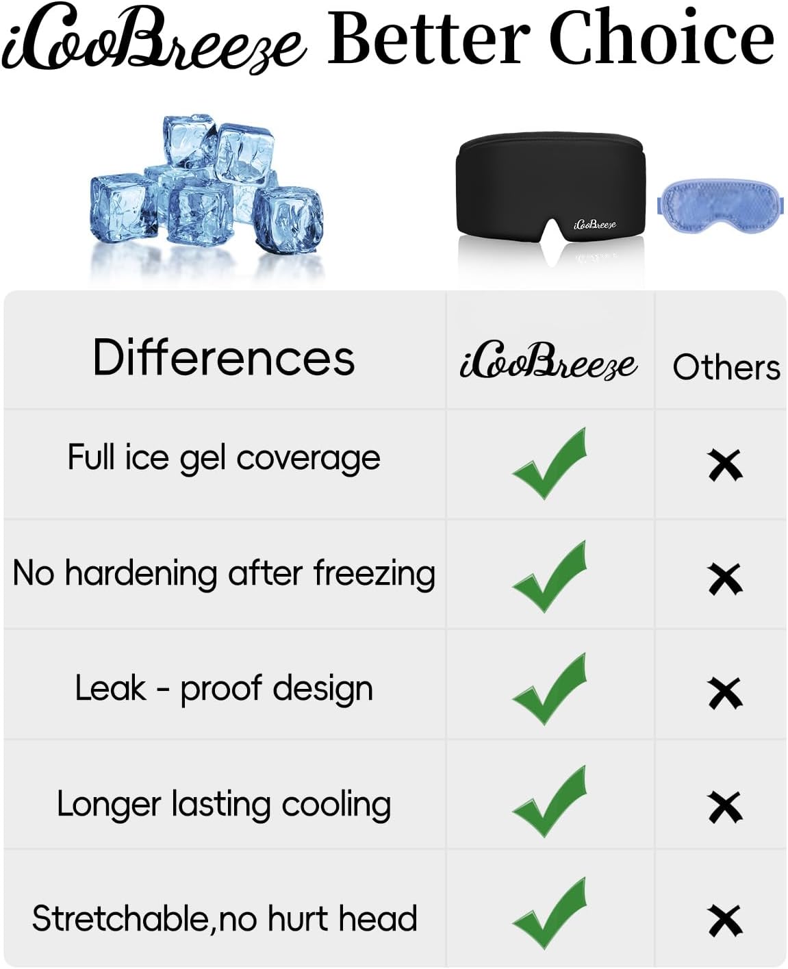 - ★WHY CHOOSE US?The iCooBreeze cooling eye mask is crafted with ultra-thick, non-toxic gel. The gel is evenly distributed, soft, and flexible—it never hardens or leaks, even after freezing. It stays cool for extended periods and is fully reusable.