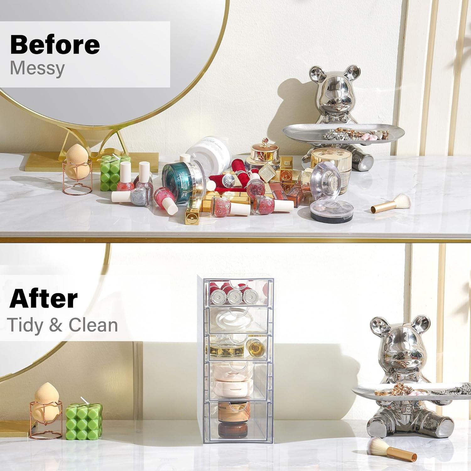 - Multi-Purpose Organization: Our acrylic drawer organizers are designed to help you organize dresser, office, and bathroom. Desk organizer with drawers are versatile enough to serve as storage solutions for Cosmetics (lipstick, blush, foundation), Office supplies (pen, paper clip, pencil), Handicrafts (various beads, Lego) and art supplies (tape, washi tape, glue), Personal accessories - sunglasses, hair accessories (hair clips, hair ties, alligator clips), jewelry, souvenirs.