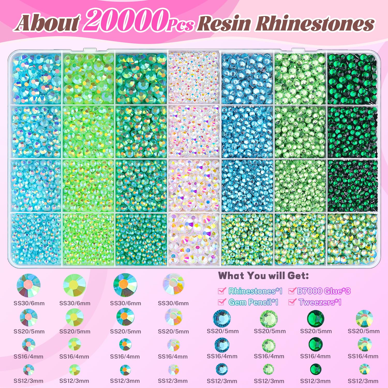 - PACKAGE CONTENT -- Include 1 box with 28 grids, featuring a variety of colors and sizes, approx. 20000 pcs bling-out resin rhinestones. 1 tweezers and 1 pickup pen are included for easily picking up of rhinestones. 3 B7000 glue for jewelry making. This all-inclusive set will meet all your needs to bedazzling your crafts