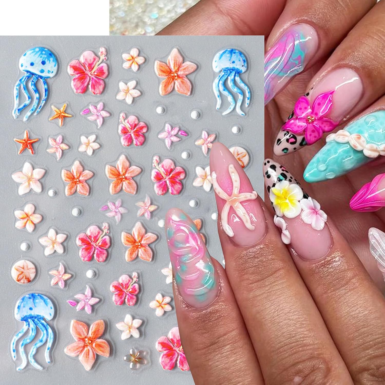 Summer Nail Art Stickers Decals Starfish Jellyfish Flower Nail Stickers Self Adhesive Nail Design 5D Embossed Nail Decals Ocean Theme Summer Manicure Sliders Accessories for Women DIY Nails Decoration