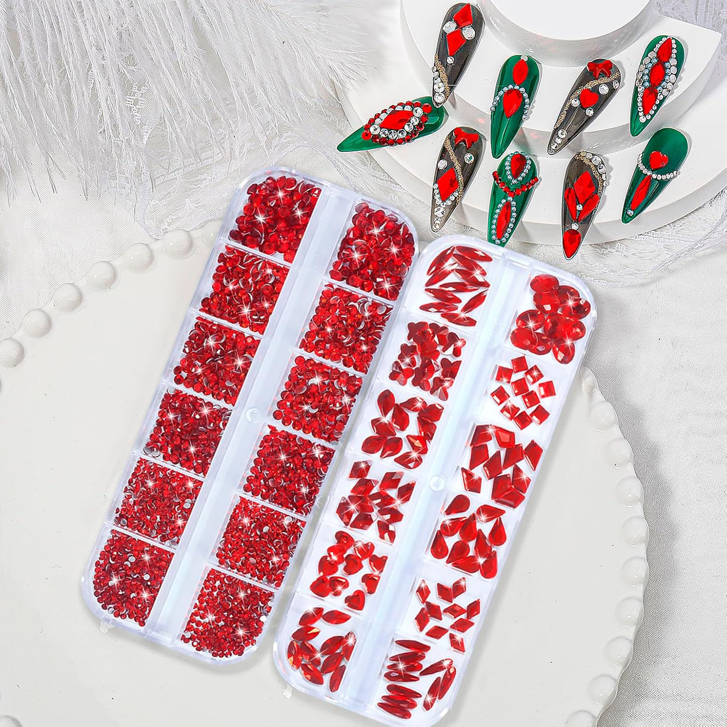 - ★Red nail rhinestones and Charms set - contains 2 boxes nail art rhinestones, flat back nail rhinestones, Multi-shape nail gem rhinestones, 1pcs tweezer for large size gems, 1pcs pickup pen for small size gems and 6 sizes round nail art rhinestones are 1.8mm, 2mm, 2.5mm, 2.8mm, 3mm, 4mm, different sizes of mixed crystal rhinestones can match different nail art styles,will bedazzle your acrylic nails!