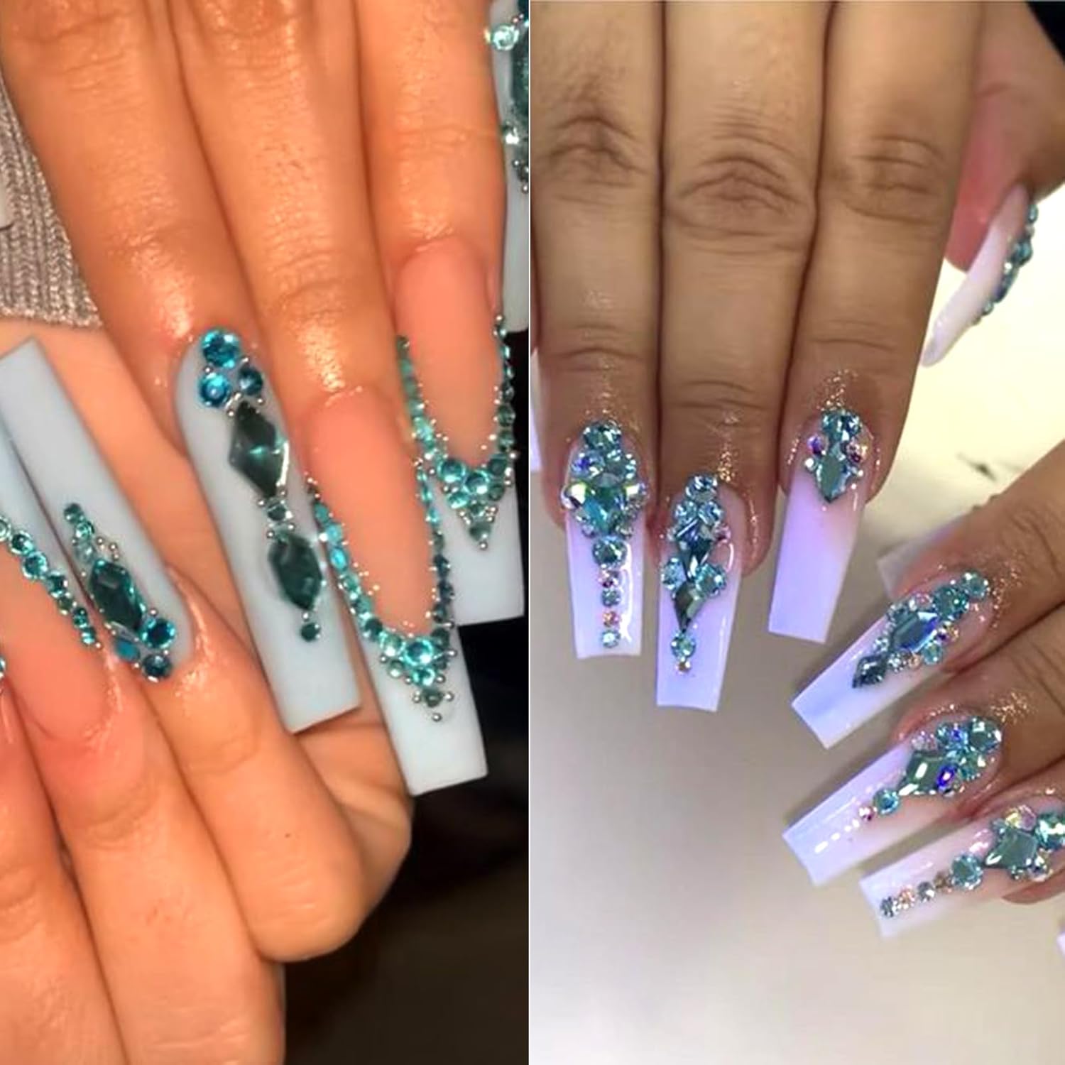 - ★Crystal Lake blue nail rhinestones and Charms set- contains 2 boxes nail art rhinestones, flat back nail rhinestones, Multi-shape nail gem rhinestones, 1pcs tweezer for large size gems, 1pcs pickup pen for small size gems and 6 sizes round nail art rhinestones are 1.8mm, 2mm, 2.5mm, 2.8mm, 3mm, 4mm, different sizes of mixed crystal rhinestones can match different nail art styles,will bedazzle your acrylic nails!