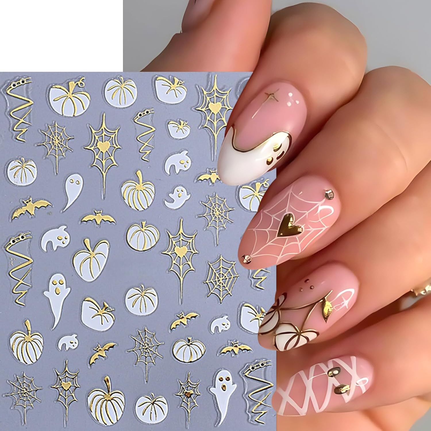 8 Sheets Halloween Nail Stickers Nail Decals 3D Self-Adhesive Glitter Pumpkin Ghost Nail Supplies Gold Heart Spider Web Bat Black Leaf Nails Design Nail Decor for Halloween Party DIY Manicure Supplies