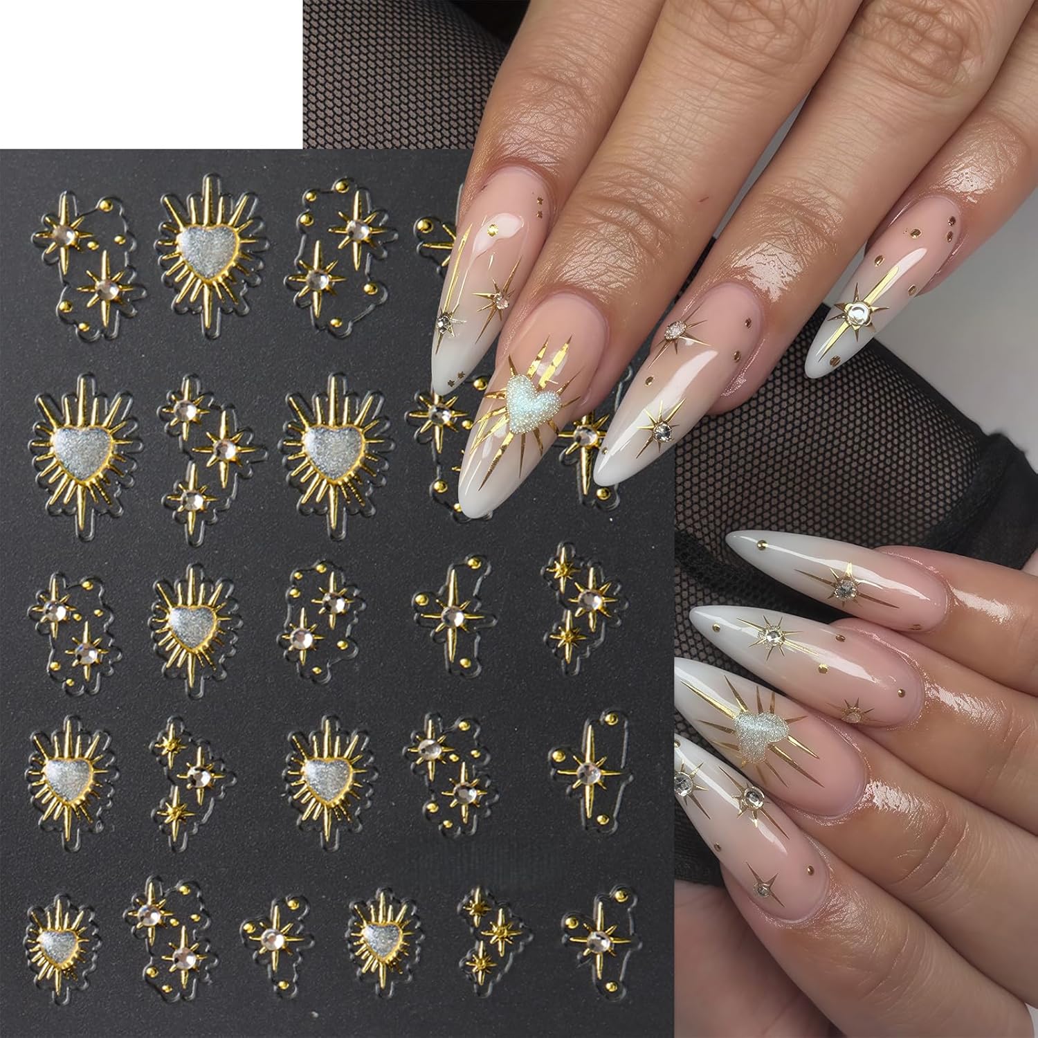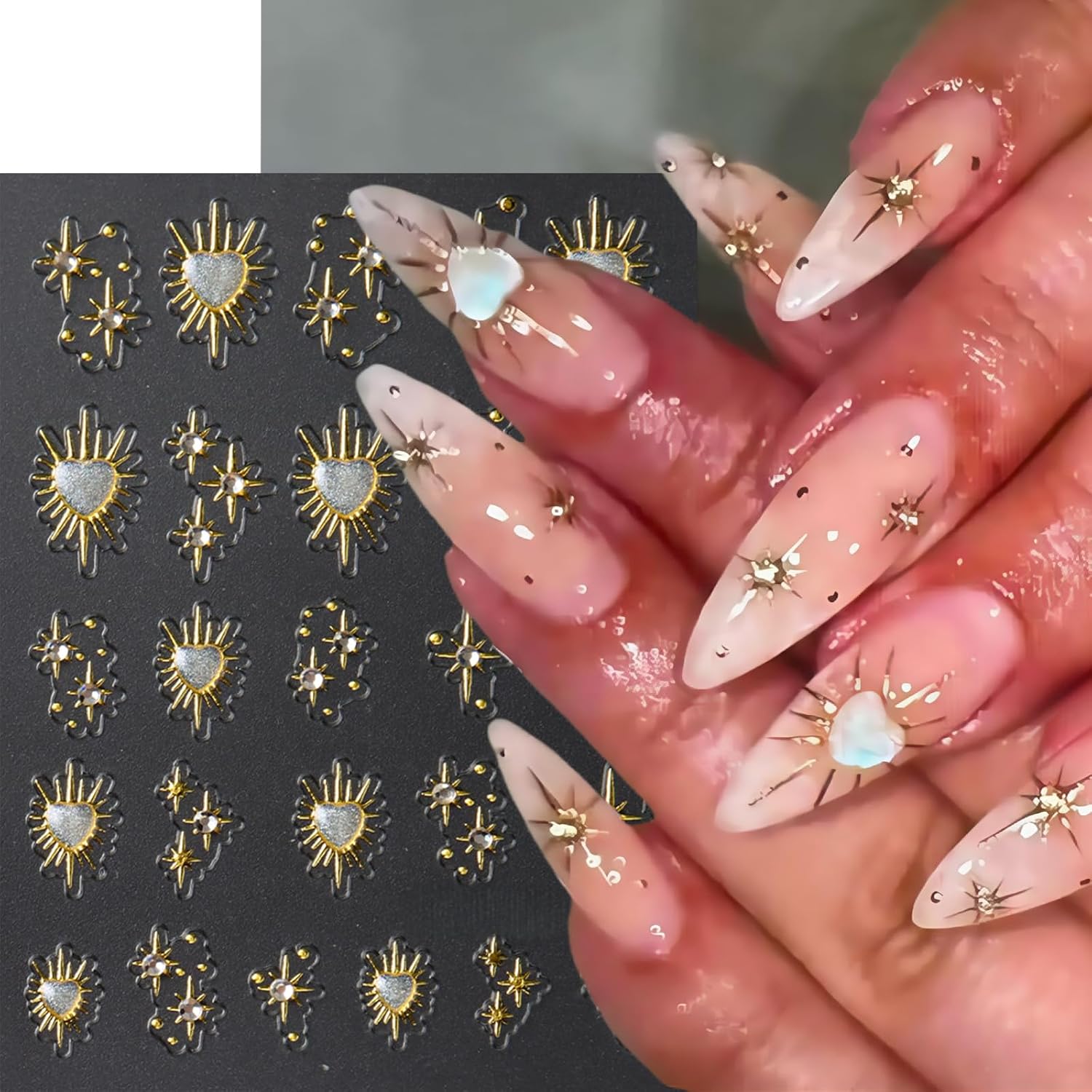 3 Sheets Star Nail Stickers for Nail Art 5D Embossed Gold Nail Decals with Heart Rhinestones Star Design Manicure Supplies Aurora Heart Metallic Star Nail Art Stickers for Women DIY Decor Accessories
