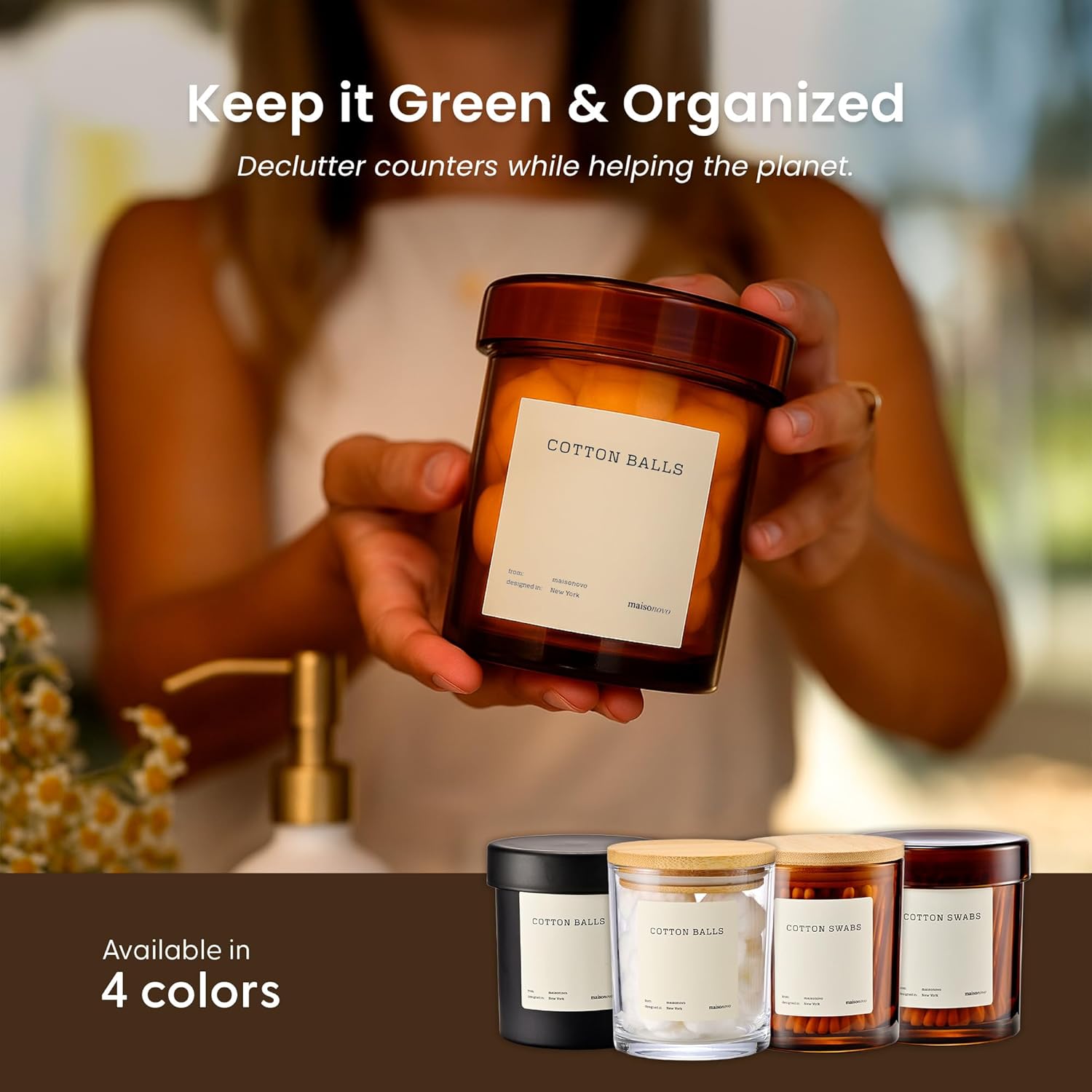 MaisoNovo Qtip Holder Bathroom Set – Airtight Glass Qtip Holder with Lid to Store Q Tips, Cotton Rounds, Cotton Balls, Floss Picks, Hair Ties with free labels pack - 2 Amber Jars with Glass Lids