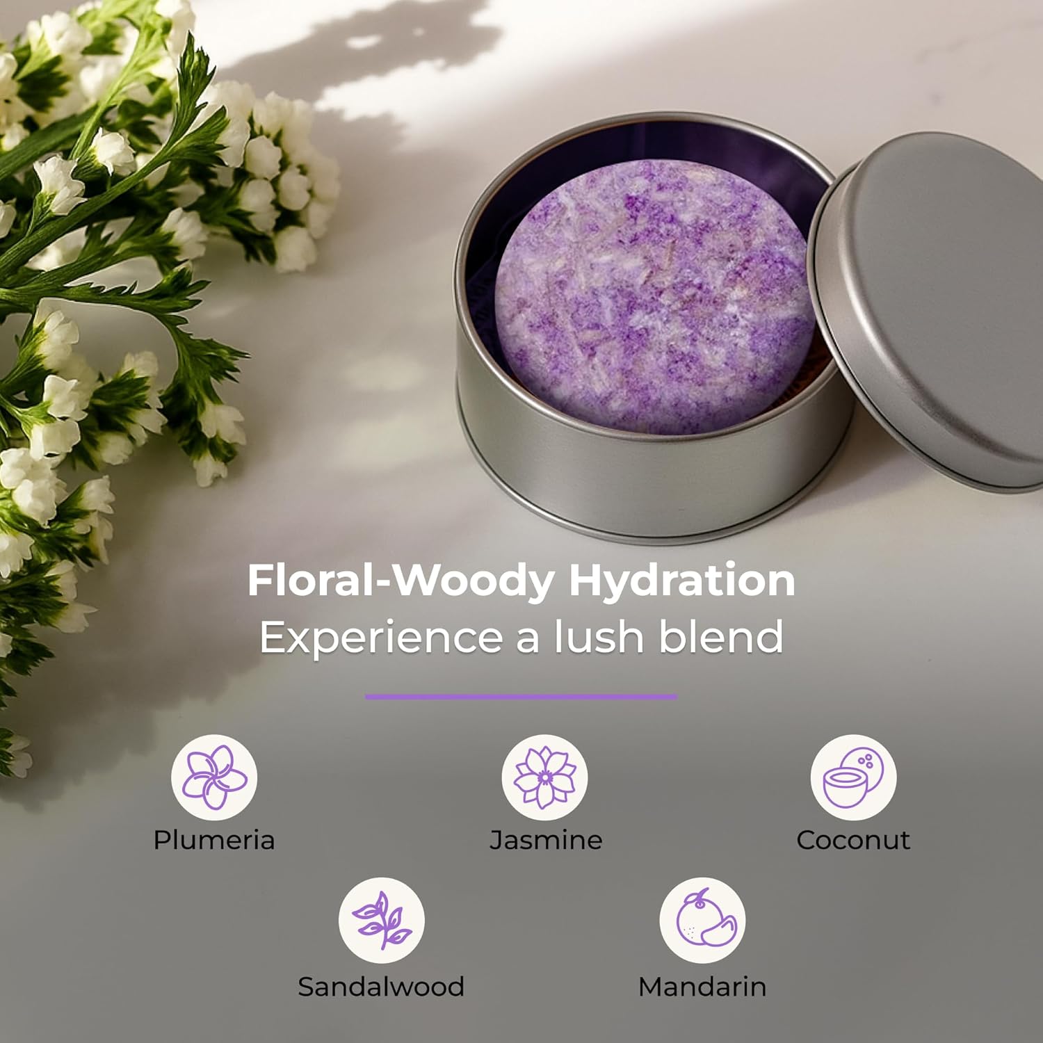 - FLORAL AND WOODSY AROMA: This vegan shampoo bar blends plumeria flower, sweet jasmine, sandalwood, coconut, and mandarin; leaves hair lightly scented with a soft, refreshing finish