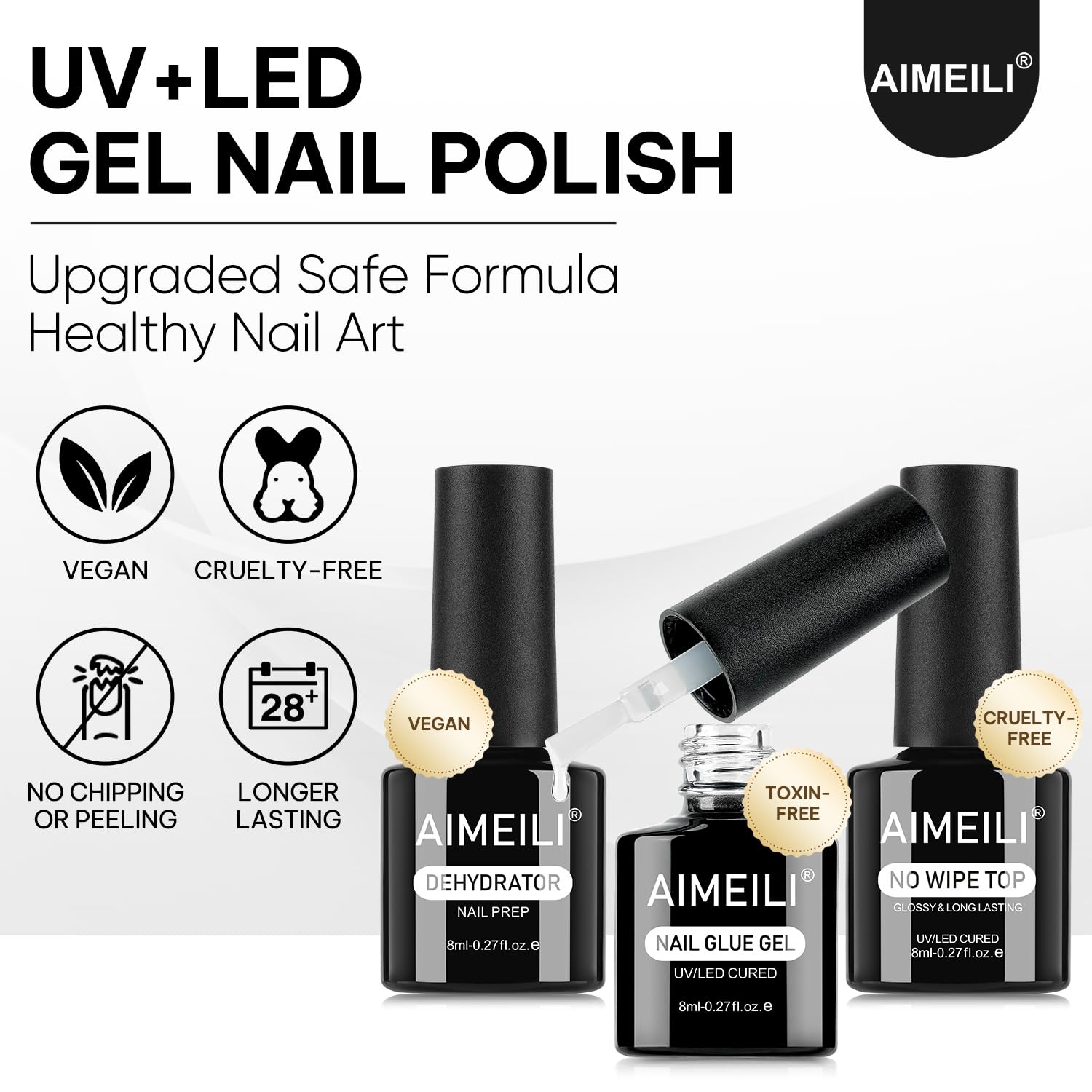 - VEGAN & CRUELTY-FREE: AIMEILI gel nail polish is vegan, cruelty-free, safer, and reliable as 90% of the raw materials are produced in the USA, Europe. Natural Resin, Toxin Free, HEMA-Free, TPO-Free formula of nail polish gel for nail art make it more gentle to apply to your nails safer and healthier