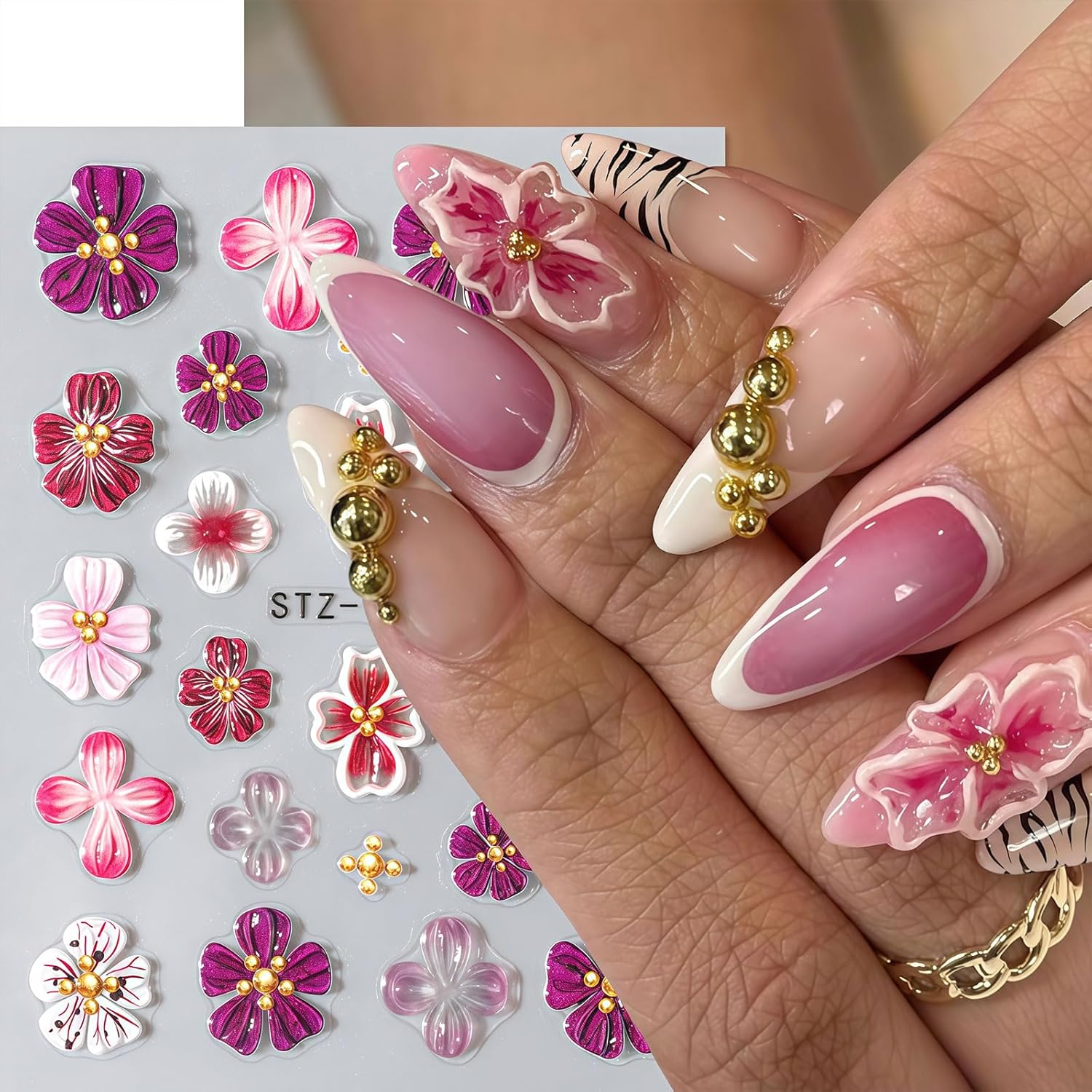 Flower Nail Art Stickers Decals, 4 Sheets 3D Self Adhesive Embossed Flower Nail Decals Nail Art Supplies Designs, Floral Nail Accessories for Women Girls