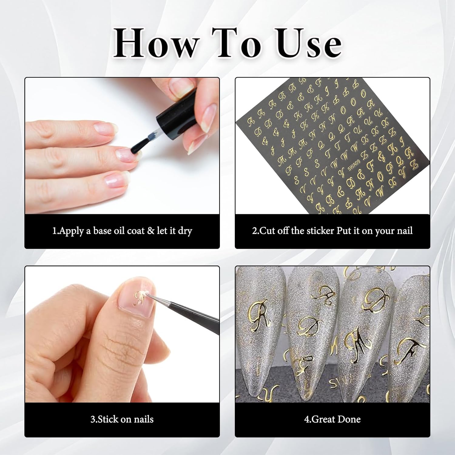 - Easy Application: Our gold nail stickers are self-adhesive, eliminating the need for glue. Using a pair of tweezers, you can easily pick up and place the small letter stickers onto your nails.For extended wear, seal the stickers for nails with a top coat to help your nail art stay in place and maintain its vibrant look.