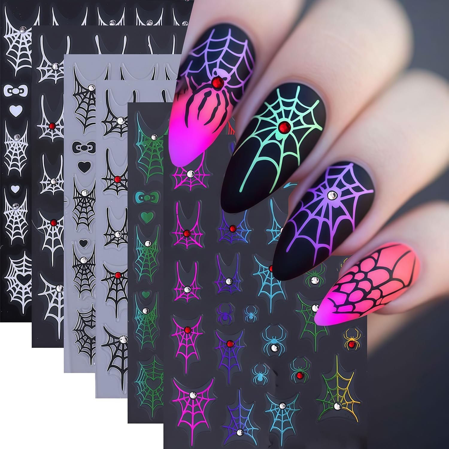 - Quantity: You will get 6 sheets of Halloween nail art stickers, including cute spider and spider web designs, not easy to fall off or fade, can easily create a variety of themed nail art, meet various nail art needs