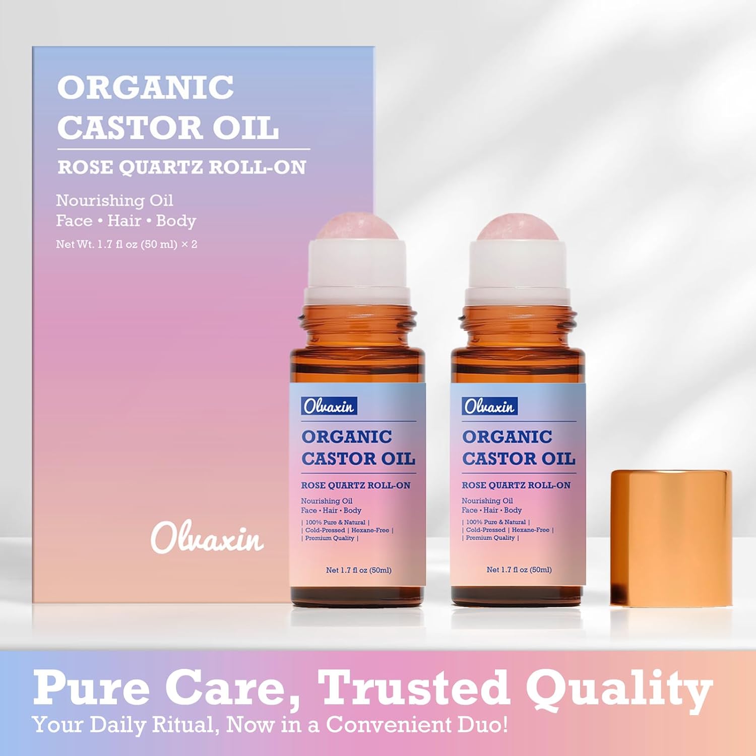 Organic Castor Oil Roll-On with Rose Quartz - 2 Pack x 50mL | Brown Glass Bottle, Cold Pressed, Hexane Free, Unrefined | Nourishing Oil for Face, Hair and Body