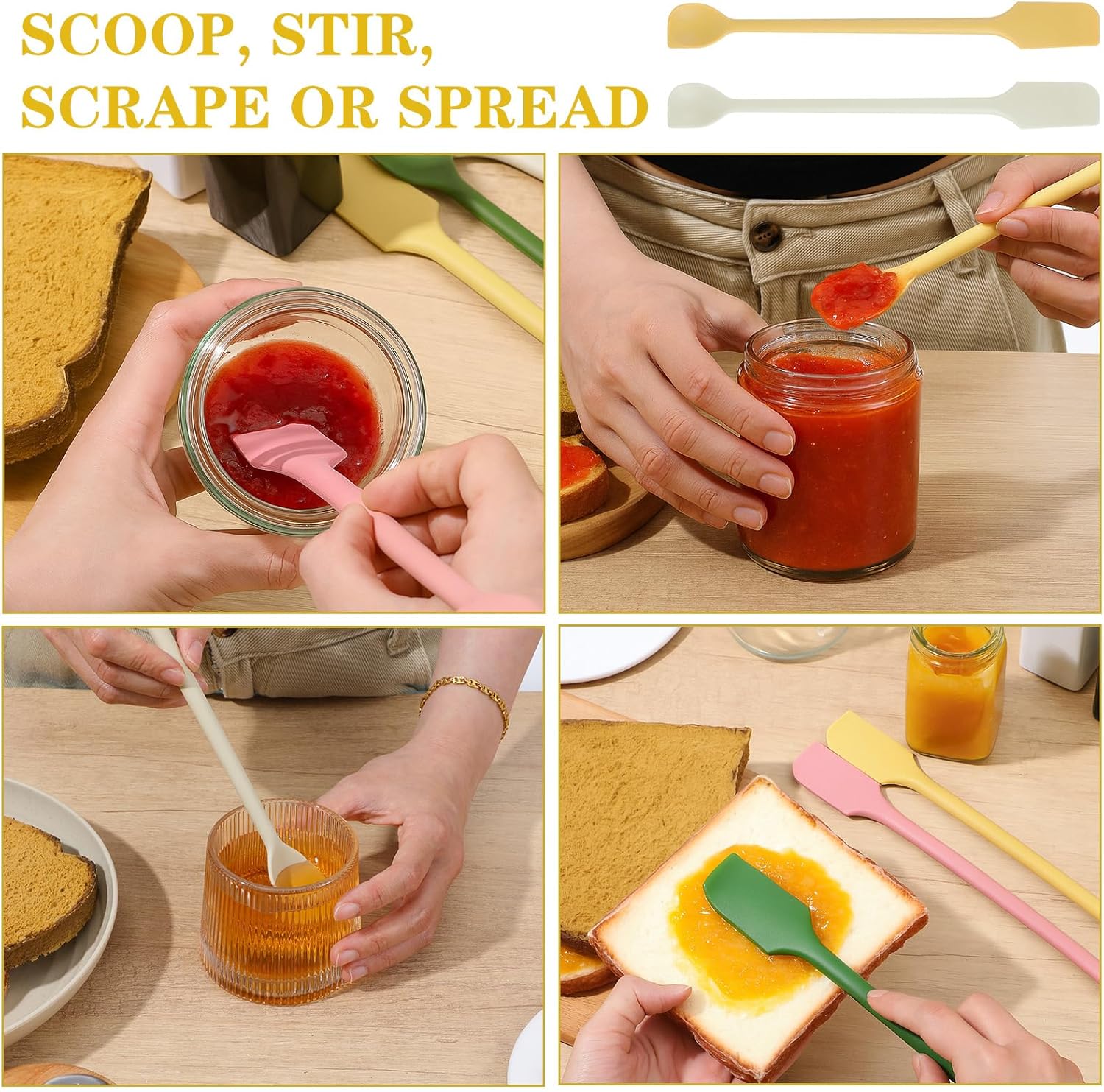 - 【Compact & Colorful】: Each mini silicone spatula comes in vibrant colors—yellow, pink, green, and white—adding a fun touch to your kitchen or beauty routine. Their compact size makes jar spatula easy to store