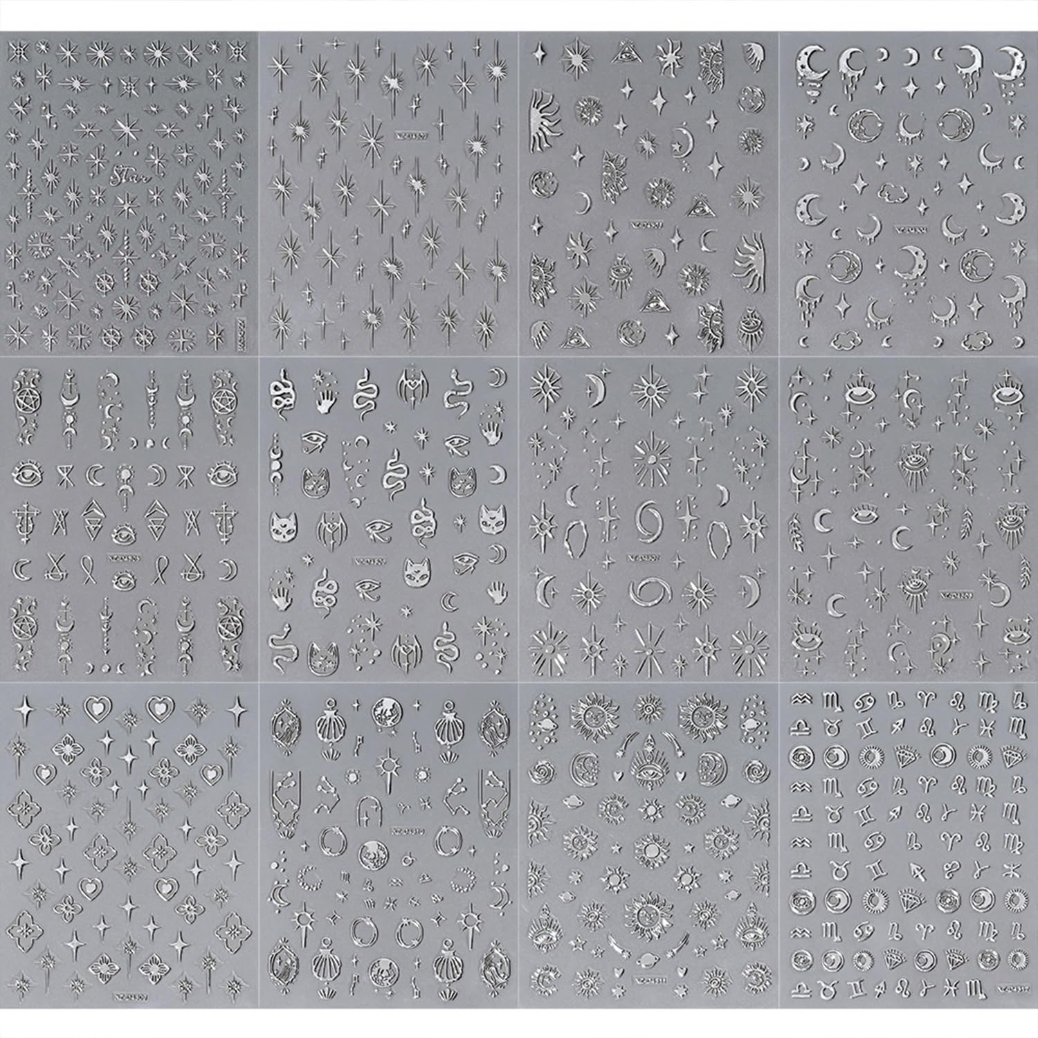12 Sheets Silver Nail Art Stickers Decals Star Moon Nails Stickers for Nail Art Self-Adhesive Snake Nails Decal