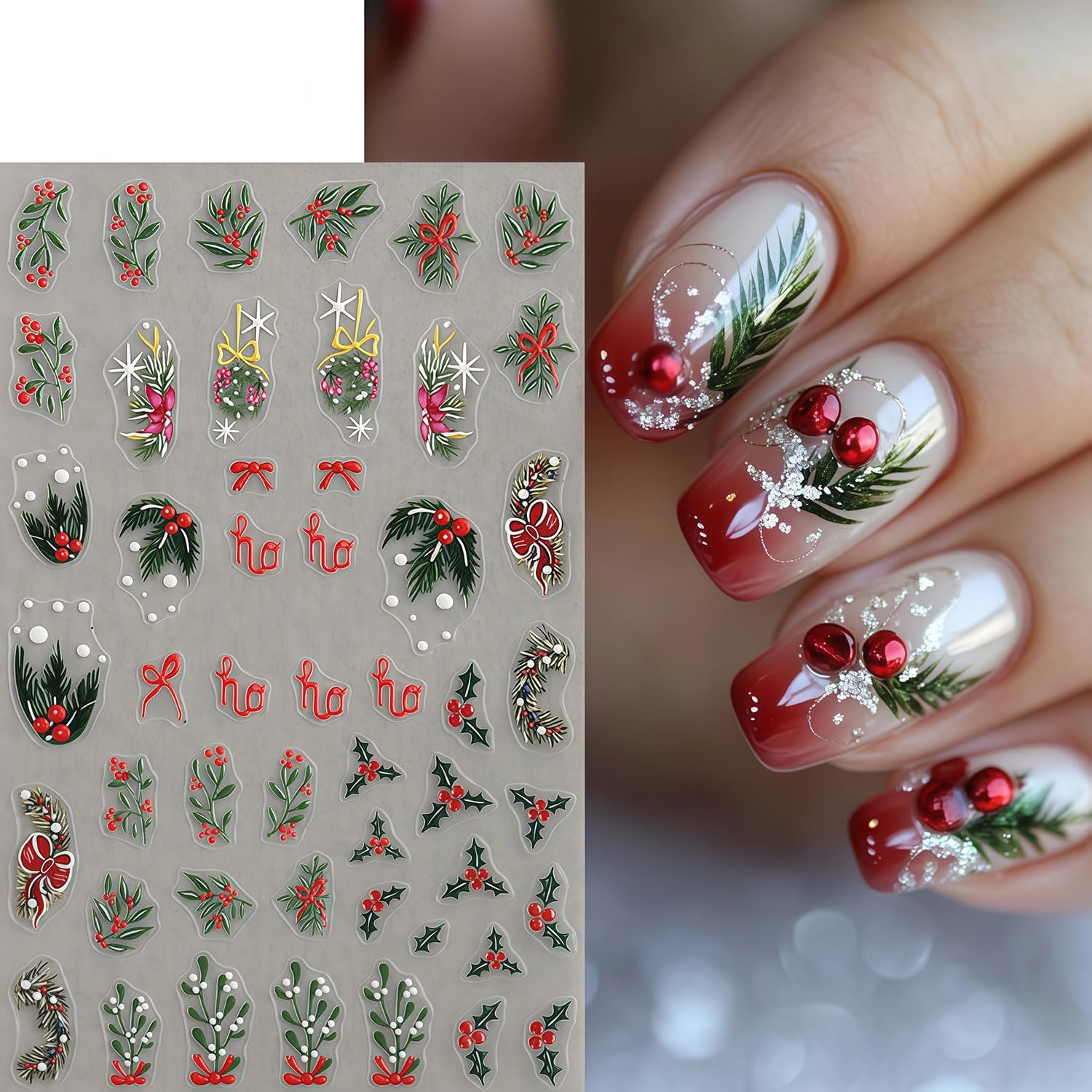 Christmas Nail Stickers 4 Sheets Christmas Nail Art Stickers, 5D Embossed Self-Adhesive Winter Leaves Snowflake Christmas Tree Flower Nail Decals Pattern Design DIY Holiday Nails Decoration for Women