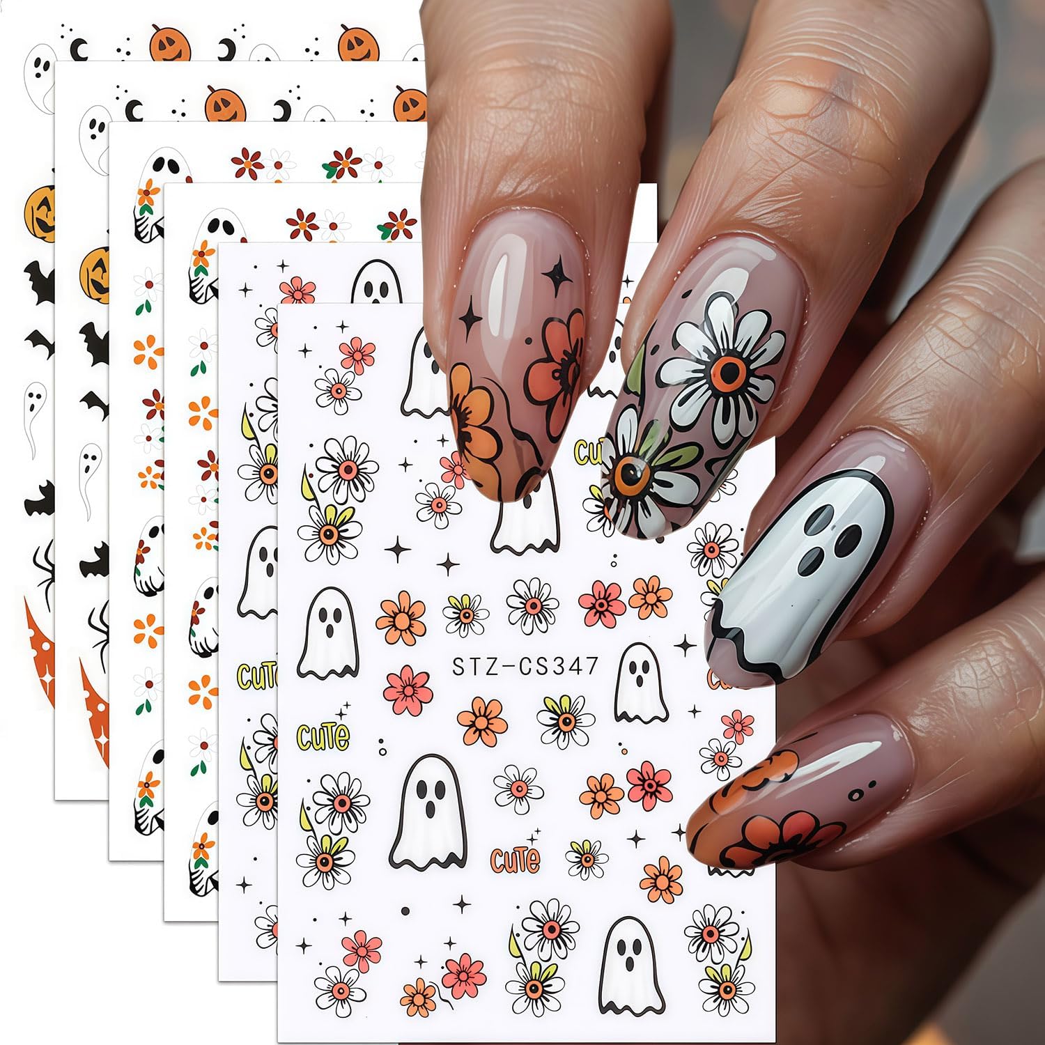 6 Sheets Ghost Nail Stickers for Nail Art, Halloween Nail Decals 3D Self-Adhesive Flower and Spooky Ghost Fall Stickers Design French Tip Nails Sticker Halloween DIY Manicure Decoration for Women